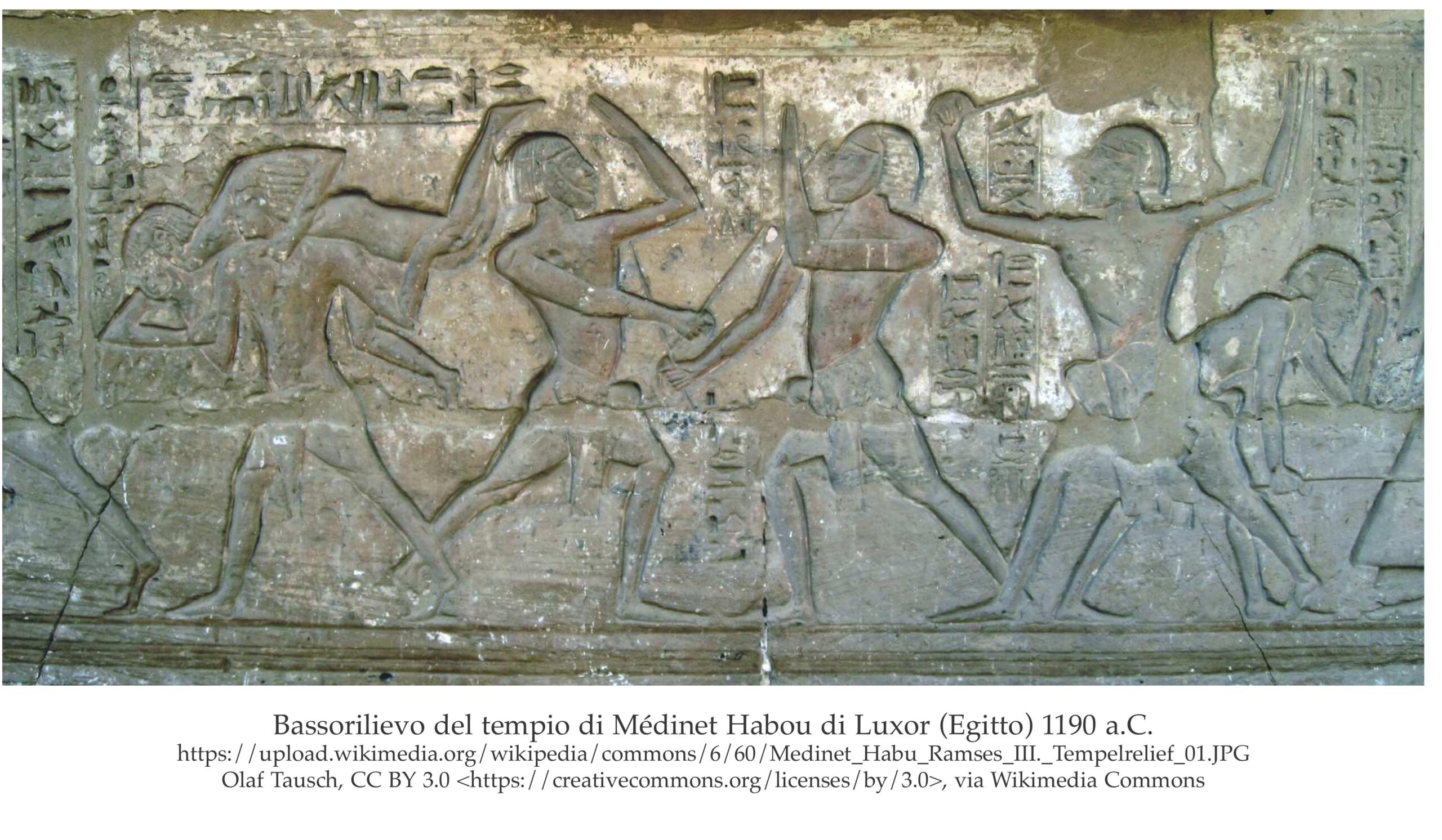 Questo può essere meno evidente. Innanzitutto per scherma si intendeva un’arte marziale completa che comprendeva la lotta senz’armi e quella con ogni tipo di armi, a piedi o a cavallo. Le armi, offensive e difensive, erano di vario tipo e la loro potenza offensiva o difensiva (e talvolta le due cose insieme) è cresciuta nel tempo col progredire della tecnica. L’agricoltura, una volta affermatasi, ha favorito la specializzazione e sedi stabili, condizioni entrambe necessarie per un trattamento avanzato delle leghe metalliche. Un nomade, un cacciatore-raccoglitore, non può forgiare da sé le proprie armi, e una fonderia non si può facilmente spostare da un luogo all’altro. Un fabbro a tempo pieno, invece, può occuparsi in profondità della sua arte solo se sostenuto da una società che, in cambio dei prodotti del suo lavoro, gli fornisca quanto occorre per vivere.