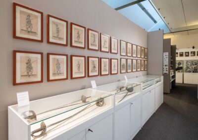 Rossa come il sangue, la sala ci riporta al tempo dei duelli d’onore, con episodi legati a personaggi e duelli celebri, come quello di Felice Cavallotti contro Ferruccio Macola, o di Aldo Nadi contro Adolfo Cotronei. Una ricca iconografia si accompagna alle vetrine che espongono spade e sciabole di grande pregio e bellezza, insieme ad antichi trattati originali, stampati dal 1500 in avanti. Procedendo, una grande vetrina espone armi bianche ed armi da fuoco risorgimentali appartenute al Comune di Busto, mentre un manichino richiama la scherma con la baionetta, con protezioni per l’allenamento appartenute al comando tedesco, con sede a Monza durante la seconda guerra mondiale. Proseguendo verso la sala delle scuole di scherma, una vetrina espone le Schläger della Mensur, il duello tradizionale tedesco, e un monitor con un video dimostrativo.