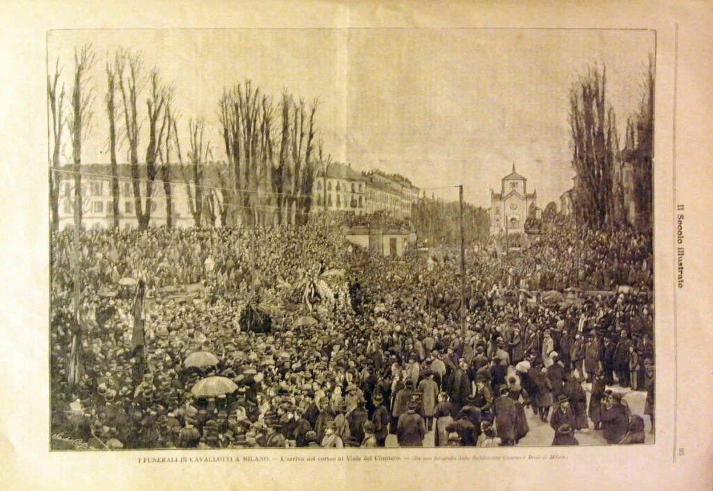 La fama del Cavallotti era tale che una folla immensa partecipò al suo funerale, a Roma, e poi lungo la tratta ferroviaria che lo portò lentamente a Milano, e infine a Dagnente, dove fu sepolto secondo le sue volontà. Fiumi di inchiostro furono versati, e il duello ispirò numerose copertine di periodici e libri. Strade e monumenti furono a lui intitolati, in tutta Italia. E persino a Parigi, se andate nei pressi del cimitero di Montmartre, troverete una rue Cavallotti. Disse Filippo Turati, nel suo discorso al cimitero Monumentale di Milano, il 9 marzo 1898: “Non un sepolcro è questo che spalanchiamo, ma un cimitero vastissimo, nel quale un’era della storia riposa; non fra due anni, come novella il lunario, ma oggi, qui, il secolo si rinnova”.