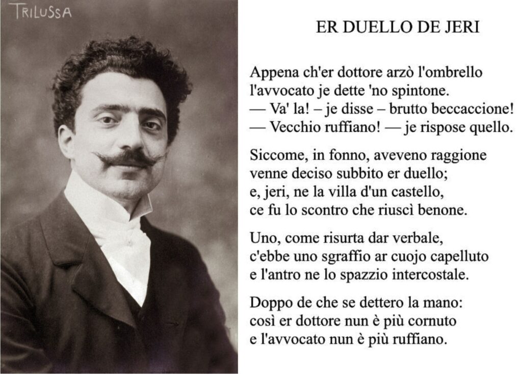 Mi piace pensare che ebbe la sua parte anche la penna di chi non si limitava ad esecrarlo, ma sapeva metterne in luce con il giusto sarcasmo le contraddizioni. Fra questi, Carlo Alberto Salustri, in arte Trilussa, che al tempo di questo duello aveva 27 anni.