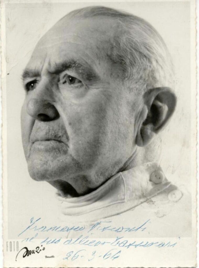 Foto di Francesco Visconti, con dedica al suo allievo Piero Tassinari, il papà di Dago, dalla sua tesi per gli esami magistrali.