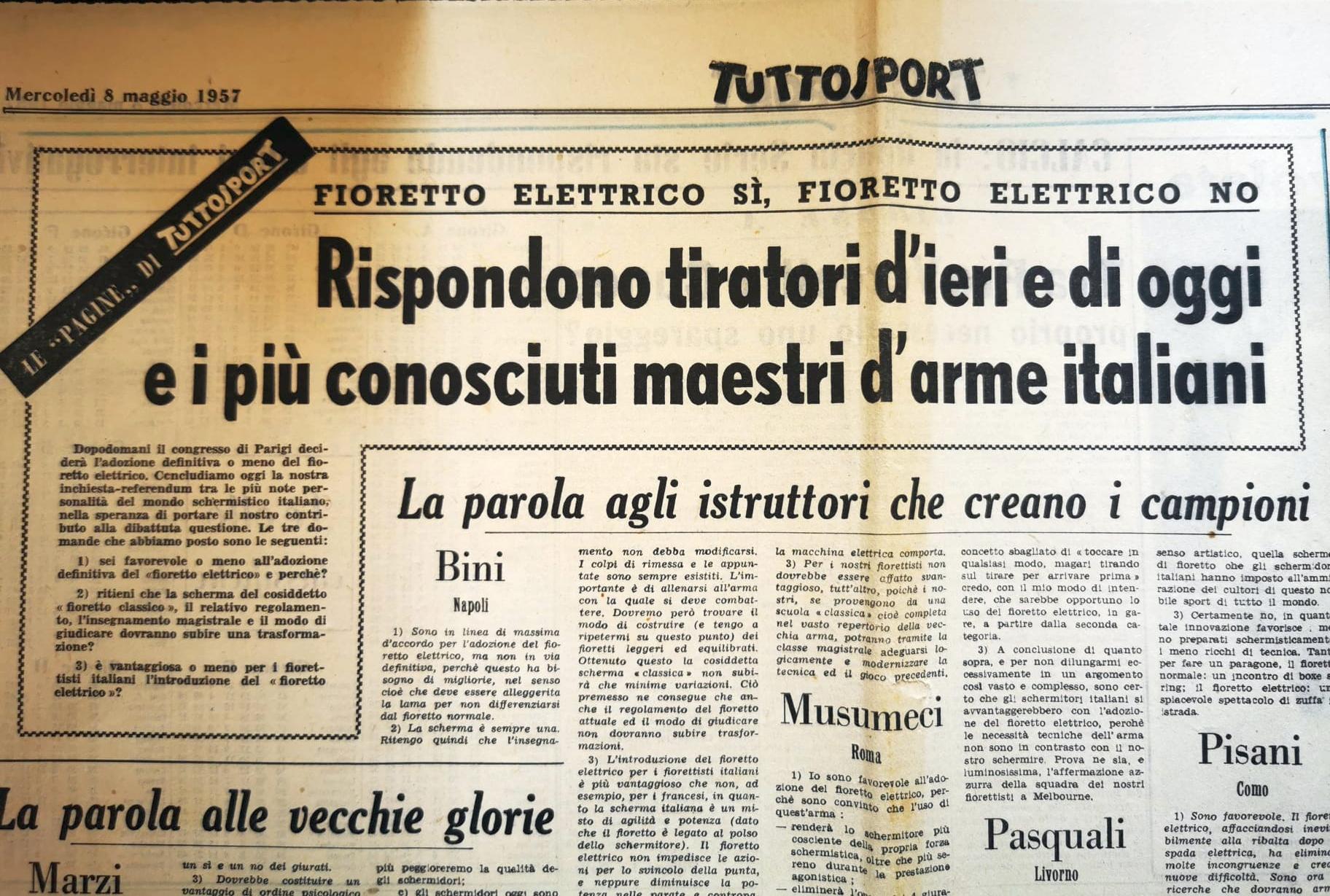 Mi è capitato in questi giorni, leggendo un articolo inviatomi dal collega e amico Dago Tassinari. È su Tuttosport, 8 maggio 1957, alla vigilia di un’importante decisione della Fie, che in quei giorni decise di adottare definitivamente la segnalazione elettrica nel fioretto, scegliendo l’apparecchio inventato dall’italiano Ing. Sergio Carmina.