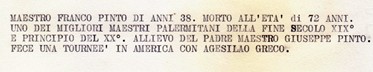 Il capostipite, Maestro Francesco Pinto, ebbe due figli, Giuseppe e Giulio, fra i migliori a cavallo del secolo, e fu il nonno di un altro Francesco, figlio di Giuseppe, che penso debba essere il “Professor Pinto” maestro di Melina. Le foto che seguono, e gli appunti a mano o dattiloscritti di Mangiarotti, compongono un altro bel frammento della scherma siciliana, sempre ricca di talenti e tradizione.