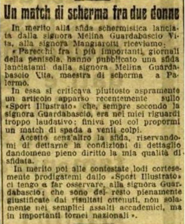 Tempo addietro sfogliavo “L’Escrime et le Tir”, preziosa miniera di informazioni schermistiche, in un periodo in cui il nostro bollettino federale stentava a decollare, e altre riviste schermistiche nascevano e morivano con frequenza. Trovai, quindi, in francese, un primo articolo in cui si parlava di questa “escrimeuse professionelle italienne”, Melina Guardabascio Vita, che per la prima volta si esibiva in pubblico, a Palermo, la sua città, nientedimeno che di fronte ad Aurelio Greco, fratello dell’ancor più famoso Agesilao. L’articolo è del marzo 1923, e Aurelio solo pochi mesi prima aveva vinto il “duello del secolo”, alla spada, contro Candido Sassone, ferendolo al braccio.
