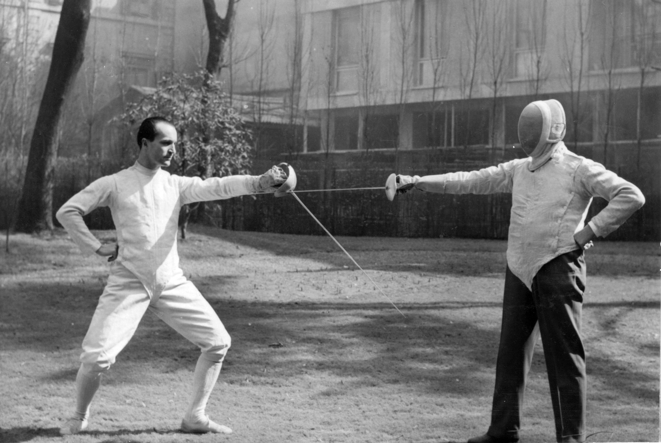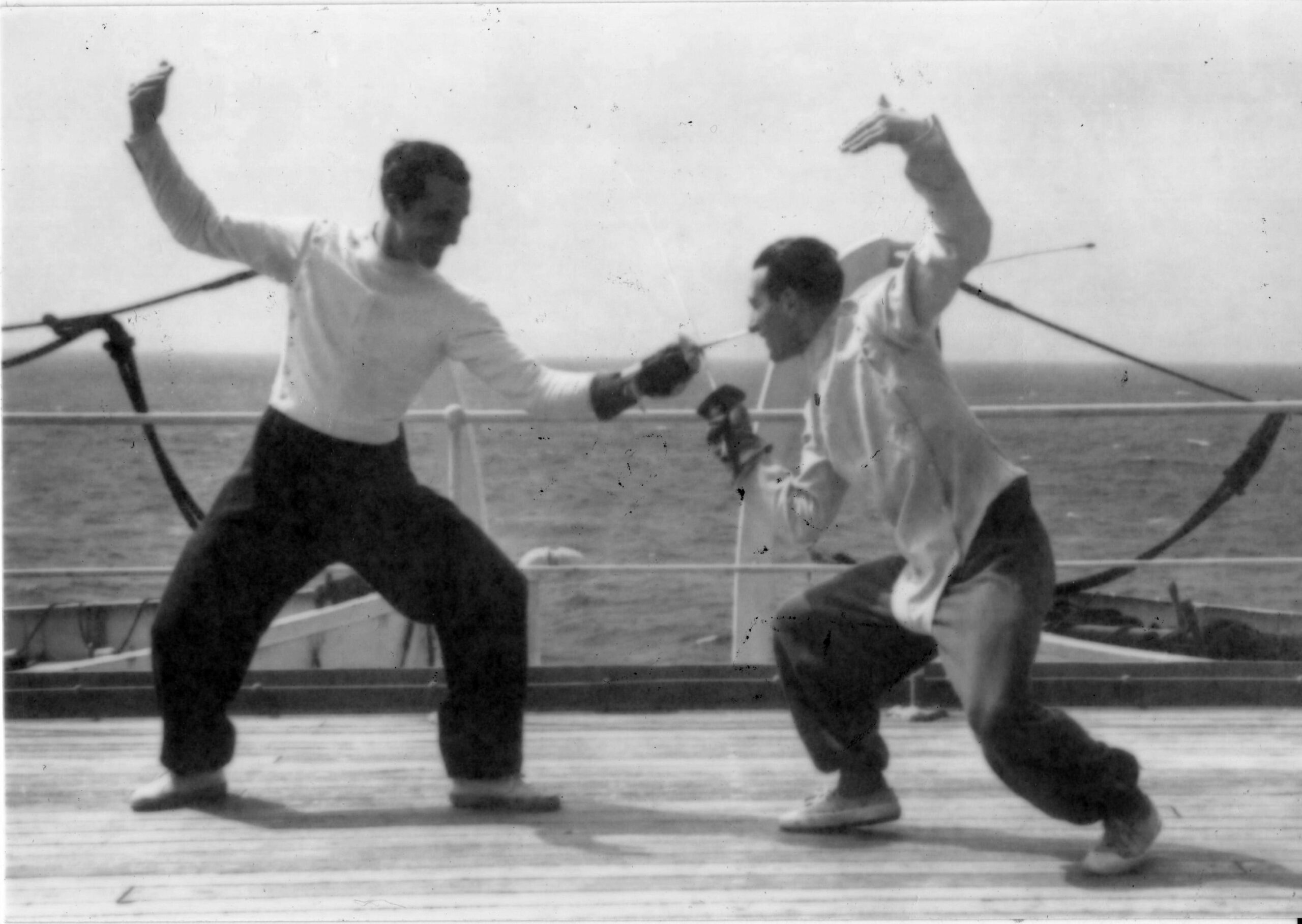 - Two pictures of Edoardo Mangiarotti en garde: the first with sabre, during a lesson with his father Giuseppe; the secondo with his brother Dario, on the ship that was bringing them to the Cairo, at the World Championships of 1949.
